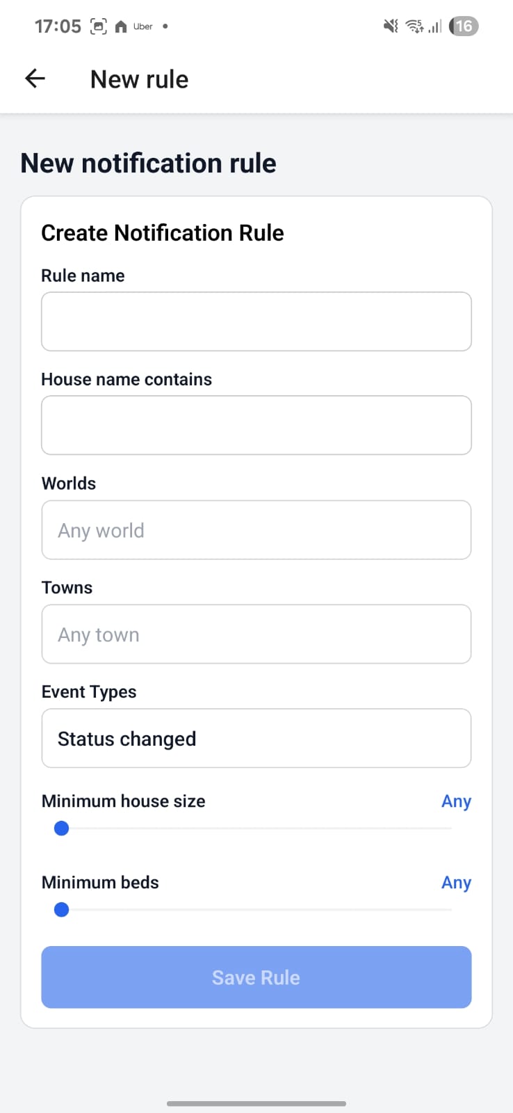 Filter by world, town, status changes, bids, size, beds, and more. Alerts trigger exactly when your conditions match.